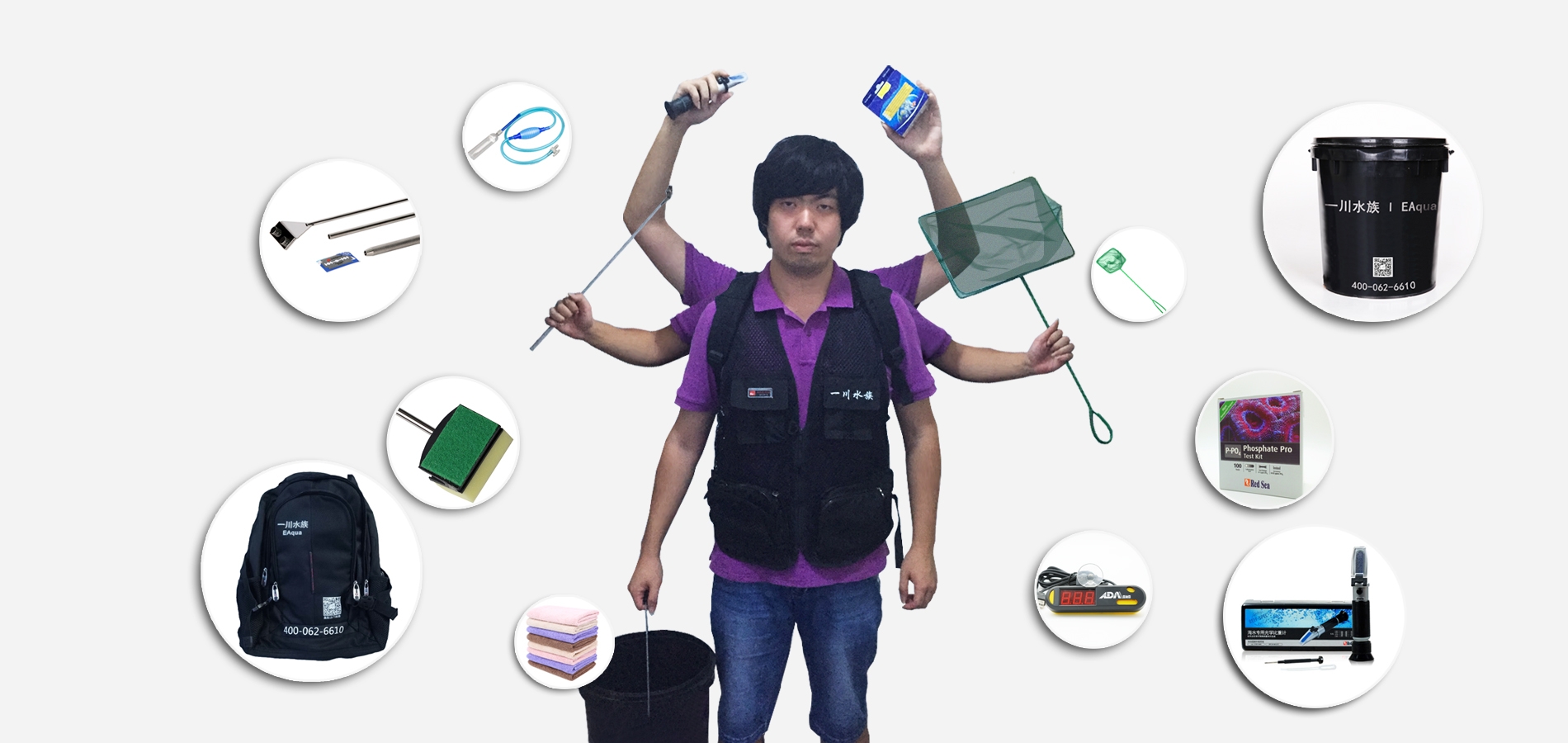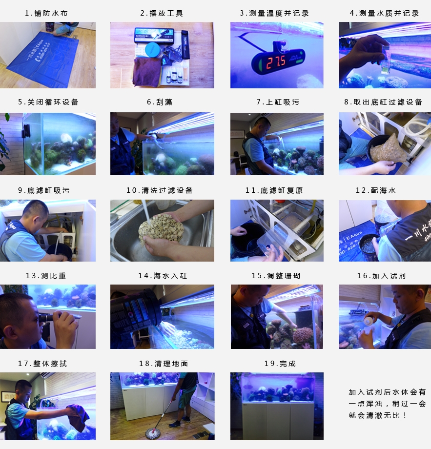 定制工作服,工具桶,防水布,刮藻刀,吸水管,换水桶,工具包,水质检测剂,盐度计,温度计,缸刷,